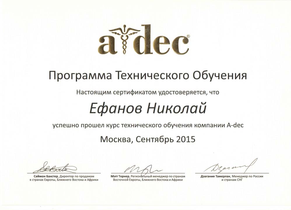Инженер компании ООО «ГРИН ДЕНТ СЕРВИС», Ефанов Николай, успешно прошел тренинг по ремонту и обслуживанию стоматологических установок A-dec.
