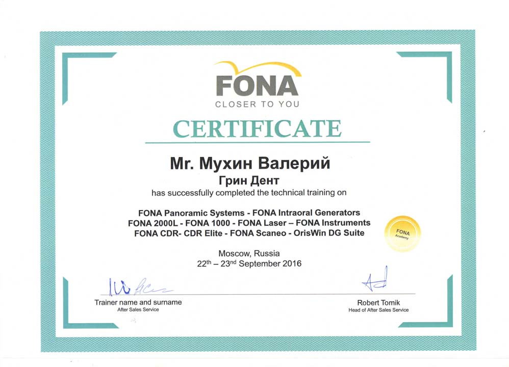Сервис инженер компании  «ГРИН ДЕНТ», Мухин Валерий, успешно прошел тренинг по оборудованию FONA.