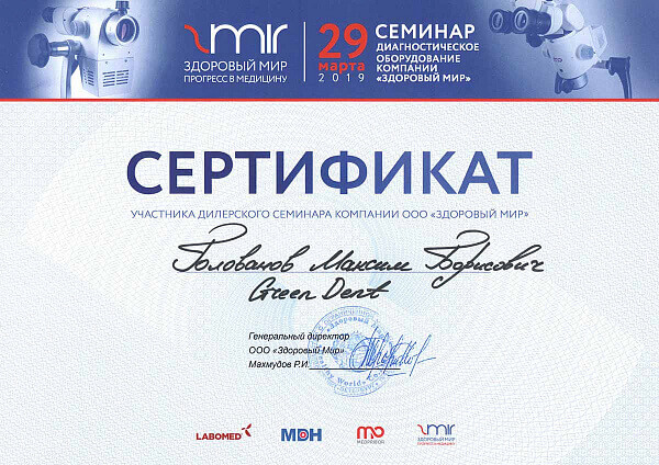Сервис инженер компании  «ГРИН ДЕНТ», Голованов Максим Борисович, успешно прошел тренинг по ремонту и обслуживанию оборудования Labomed, Medpribor, MDH и Здоровый мир.